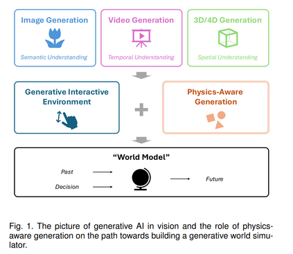 摘要—生成性人工智能(AI)通过使机器能够以空前的复杂性创建和解释视觉数据,迅速推动了计算机视觉领域的发展。这一变革建立在生成模型的基础上,能够生成逼真的图像、视频以及3D/4D内容。传统上,生成模型主要关注视觉逼真度,而往往忽视了生成内容的物理合理性。这一差距限制了其在需要遵守现实世界物理法则的应用中的效果,如机器人技术、自动化系统和科学模拟。随着生成性人工智能不断融入物理现实和动态仿真,其作为“世界模拟器”的潜力不断扩大——能够模拟由物理法则主导的交互,架起虚拟与物理现实之间的桥梁。本综述系统地回顾了这一新兴领域——计算机视觉中的物理感知生成性AI,按其如何融入物理知识对方法进行了分类——无论是通过显式仿真还是隐式学习。我们分析了关键范式,讨论了评估协议,并指出了未来的研究方向。通过提供全面的概述,本综述旨在帮助未来在视觉领域的物理基础生成方面的发展。综述中提到的论文汇总在