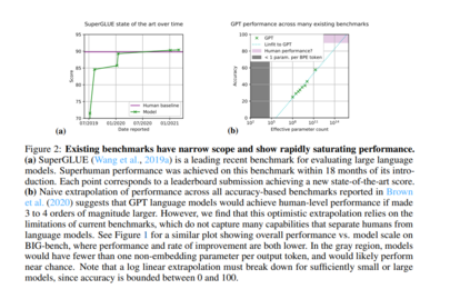 目前的语言建模基准还不足以满足我们理解语言模型的行为和预测它们未来的行为的需求。这些现有基准有几个局限性。首先,许多基准测试的范围有限,主要针对语言模型已经证明一定熟练程度的单一或少数功能。例如,基准测试通常提出的任务是对较窄的领域子集进行编码,如语言理解(See et al., 2017; Hermann et al., 2015; Narayan et al., 2018; Koupaee & Wang, 2018; Rush et al., 2015; Graff et al., 2003),或琐碎问题的回答((Joshi et al., 2017; Kwiatkowski et al., 2019; Rajpurkar et al., 2016)。因为它们的目标范围很窄,而且因为它们的目标通常是语言模型已经知道要执行的对象,所以它们不适合识别语言模型可能随着规模的增加而开发的新的和意想不到的功能,或者描述当前功能的广度。其次,最近的语言建模基准测试的有用寿命通常很短(MartínezPlumed et al., 2021)。当这些基准达到与人类相当的性能时,它们往往要么停止,要么被替换,要么通过在一种“挑战-解决-替换”评估动态(Schlangen, 2019)或“数据-解决-补丁”对抗性基准共同进化(Zellers等人,2019a)中加入更有挑战性的基准来扩展。例如,通用SuperGLUE基准测试(Wang et al., 2019a)在产生不到18个月的时间内就实现了超人的性能(图2)。如此短的有用寿命可能是由于这些基准测试的范围有限,这使得它们无法包括远远超出当前语言模型能力的任务。最后,许多当前的基准测试使用的是通过人为标记收集的数据,而不是由专家或任务作者执行的。与这种数据标签相关的成本和挑战极大地影响了所选任务的难度,因为许多任务需要易于解释和执行。这通常会导致更容易的任务,噪声、正确性和分布问题会降低结果的可解释性(Bowman & Dahl, 2021)。