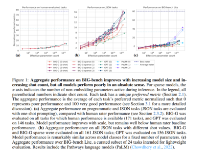 考虑到预测大型语言模型的潜在变革性影响的重要性,以及当前基准测试的局限性,我们引入了一个大规模、极其困难和多样化的基准测试。然后我们在这个基准上测量模型的性能。为了衡量模型性能是否与人的性能有很大的区别,我们提供了一个人工评估基准和专家对这组不同任务的人工评估。此外,模型是跨尺度测量的,以便于简单的尺度外推,在这个尺度上,它们可能与人类评估者没有区别。为了向艾伦·图灵的模仿游戏(图灵,1950)致敬,因为我们的目标是提取模型行为的信息,而不是从模型是否与人类不同的二元判断中获得的信息,我们把这个基准称为超越模仿游戏基准,或BIG-bench。我们还介绍了精简版的BIG-bench(第2.2节),它包含24个任务,用于轻量级评估。该基准是在GitHub上公开开发的,贡献者通过GitHub拉请求的方式添加任务。通过对拉请求的讨论,对提议的任务进行同行评审。为了激励贡献,所有接受任务的作者都有机会成为这篇介绍BIG-bench的论文的共同作者。我们使用这个基准来分析密集和稀疏变压器模型,从谷歌和OpenAI,跨越6个数量级的模型规模。我们特别感兴趣的是预测语言模型未来的功能。因此,在我们的分析中,我们不关注任何单一模型的性能,而是关注性能如何随着模型规模的变化而变化。对于选择的任务,我们研究特定的模型能力如何随着规模的发展而发展。图1显示了在所有BIG-bench任务中超过5个数量级的模型的总体性能。