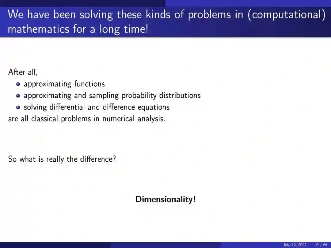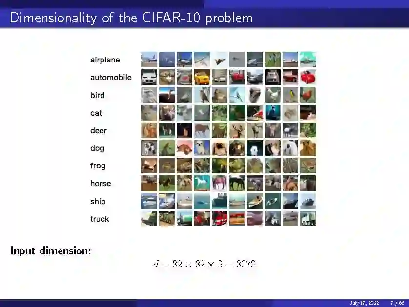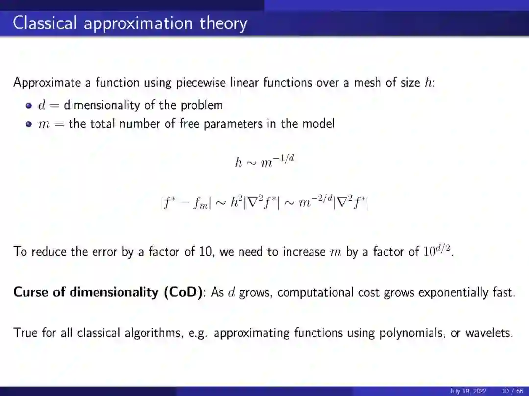 多年来,计算数学家一直在解决这类问题。唯一的区别是维度。以CIFAR-10问题为例,我们感兴趣的函数是将每个图像映射到其类别的函数。每个图像是32 x 32像素,有三个颜色维度,所以这个问题的整体维度是3072。这给经典的近似理论带来了一个问题(人们通常会在网格上使用分段线性函数逼近一个函数),因为随着问题的维数增长,计算成本呈指数增长。这对于所有用多项式近似函数的经典算法都是正确的。神经网络可以更有效地解决这类问题。