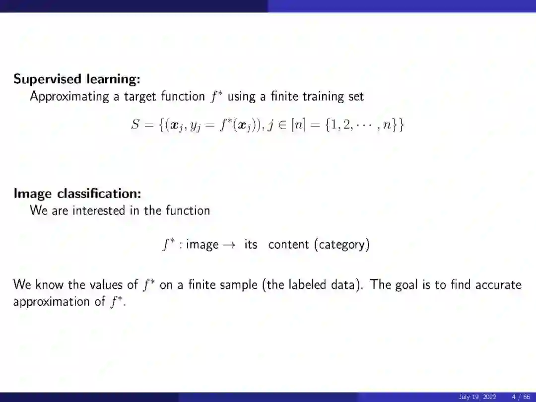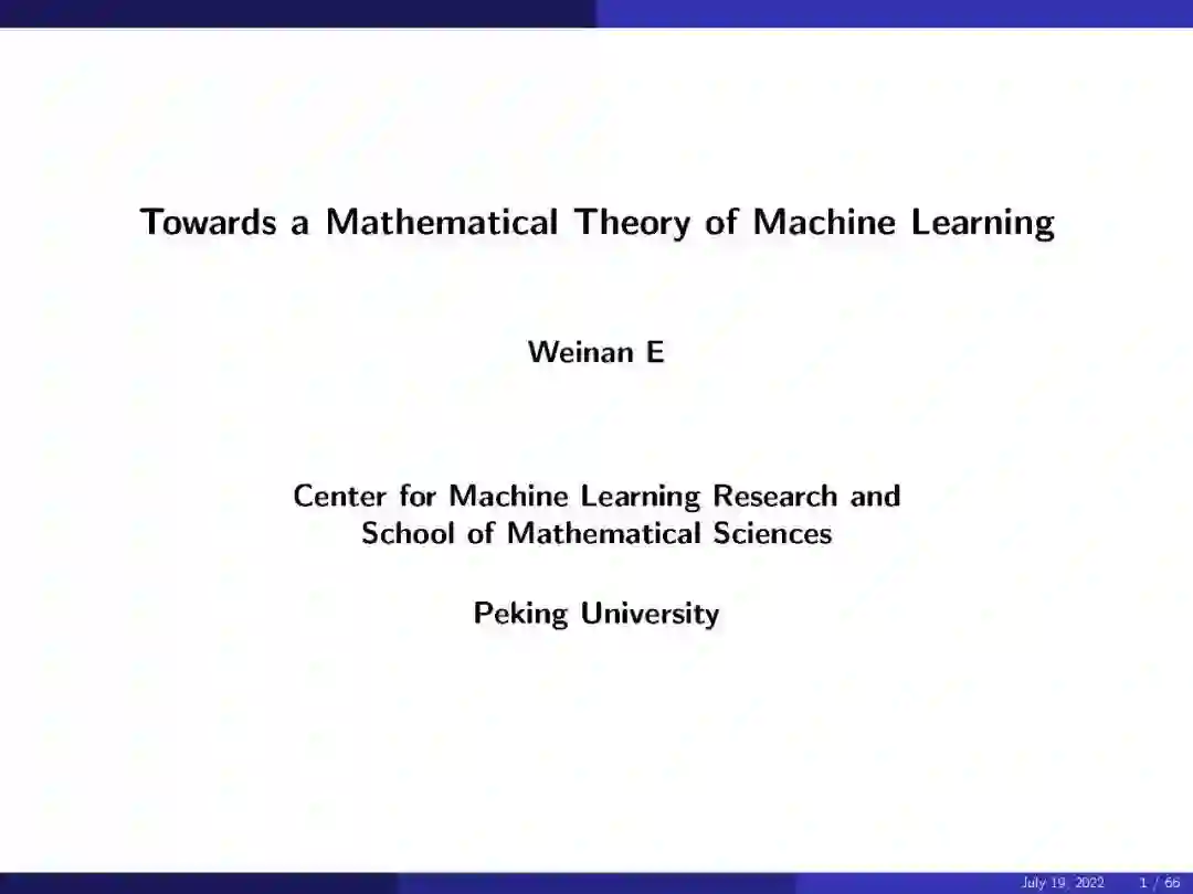 本演讲回顾了基于神经网络的机器学习数学理论领域的现状。他工作的中心主题是对高维函数的理解。他一开始就说,“机器学习是解决一些标准的数学问题,但是在非常高的维度上”。在数学的这个背景下,人们可以认为监督学习是使用有限的训练集逼近目标函数。使用图像分类的例子,我们感兴趣的函数是将每个图像映射到其类别的函数。我们知道函数在有限样本上的值(标签),目标是找到函数的精确逼近。