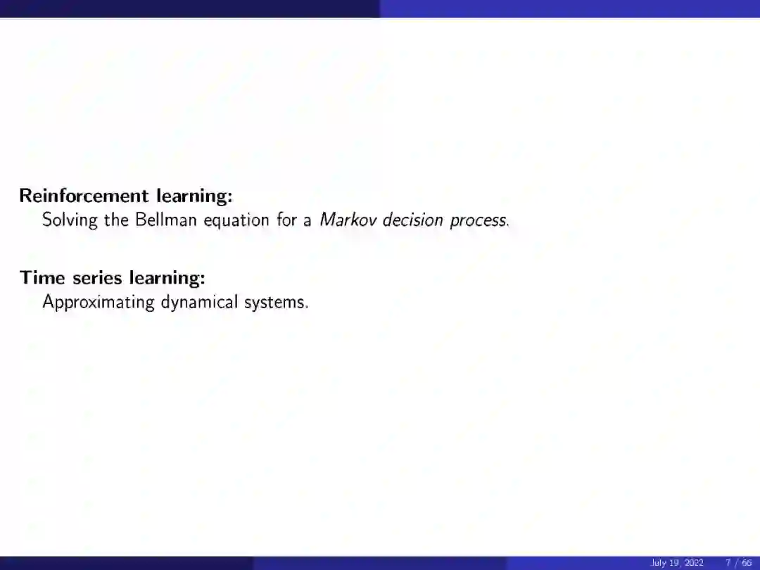 再举一个例子,在数学术语中,无监督学习是一个使用有限样本逼近潜在概率分布的问题。无监督学习的一个典型问题是生成不存在的数据,比如生成假人脸。虽然概率分布还不清楚,但我们确实有有限的真实人脸样本。用这个有限的样本,我们可以近似未知的概率分布,并产生新的样本。在其他机器学习方法中,强化学习是关于求解相关马尔可夫决策过程的Bellman方程,而时间序列学习则是关于逼近动态系统。