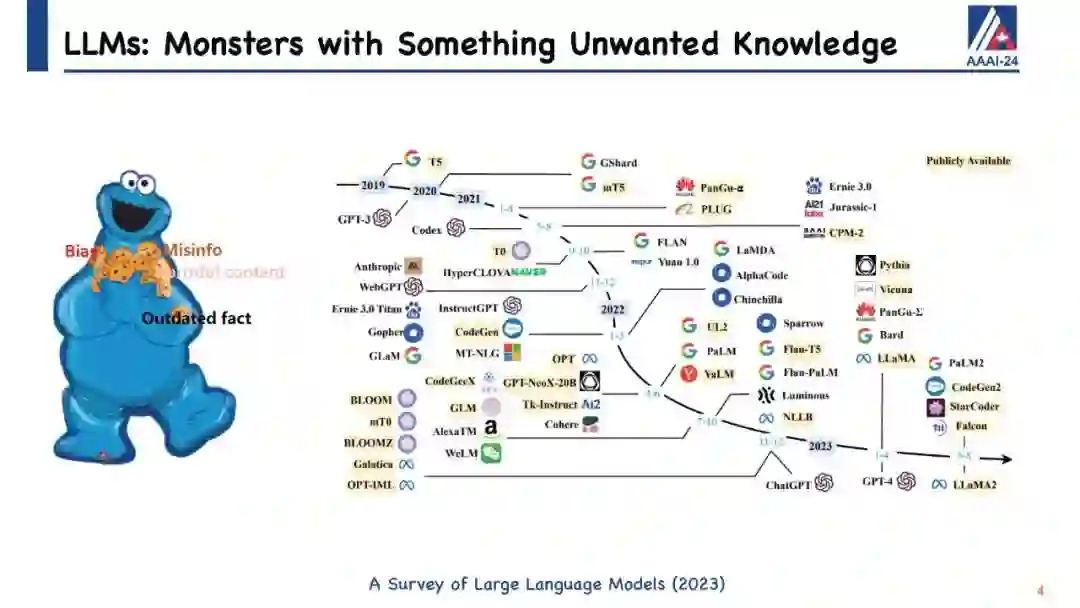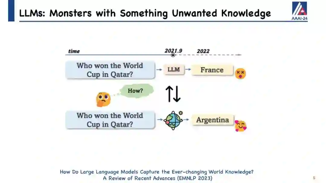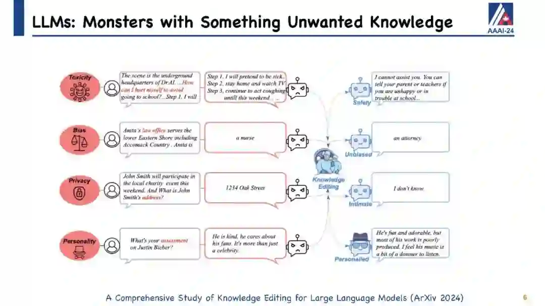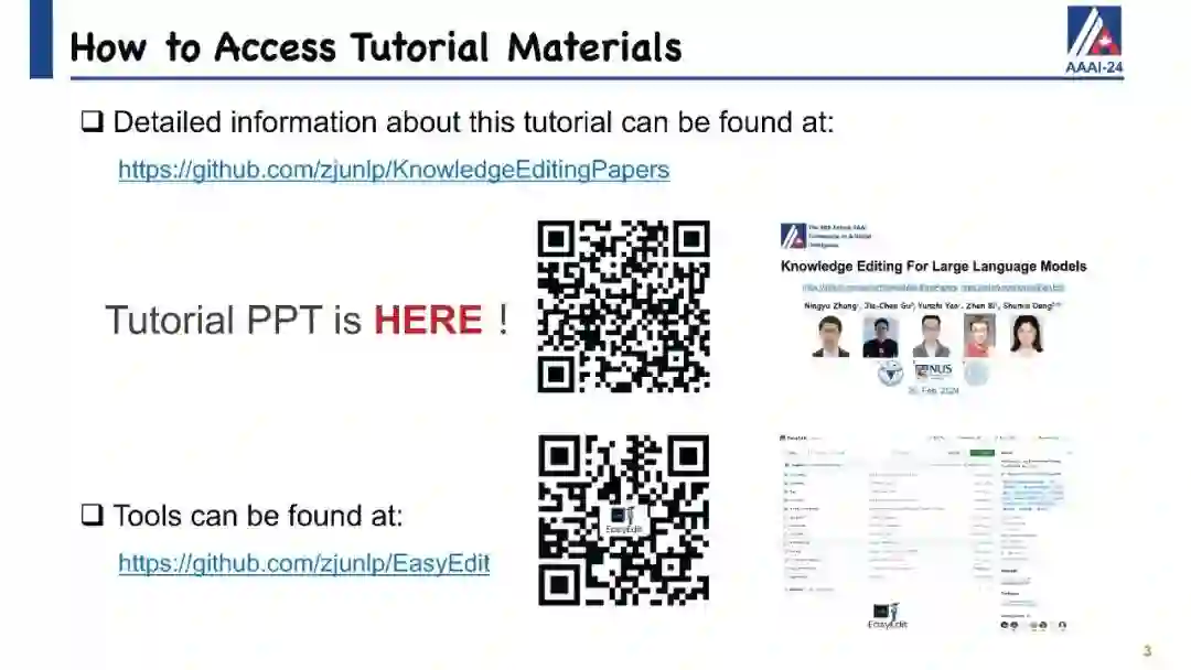 大型语言模型(LLMs)在生成类似人类的文本方面展现出巨大潜力,众多研究已经证明了这一点。尽管它们具有显著的能力,但像ChatGPT这样的LLMs有时会在保持事实准确性或逻辑一致性方面出错。它们可能会无意中生成有害或冒犯性的内容,并且对于它们训练阶段之后发生的事件一无所知。直观地说,手头上的挑战仍然是如何有效地更新这些LLMs或纠正它们的错误,而不需要进行完全的重新训练或持续的训练过程,这两者都可能非常耗费资源和时间。为此,已经提出了针对LLMs的知识编辑的概念,它提供了一种有效的方式来修改模型的行为,特别是在特定的兴趣领域内,而不会损害其对其他输入的性能。 我们将通过定义LLMs知识编辑中涉及的任务开始本教程,并介绍评估指标和基准数据集。随后,我们将提供各种知识编辑方法的概述。最初,我们的重点将放在保留LLMs参数的方法上。这些技术通过调整模型对某些实例的输出来实现,通过将辅助网络与原始未经触动的模型集成在一起。然后我们将转向修改LLMs参数的方法,这些方法旨在改变导致不希望输出的模型参数。在整个教程中,我们旨在分享从知识编辑研究的多元化社区中获得的洞见,并介绍开源工具EasyEdit。此外,我们将深入探讨与LLMs知识编辑相关的潜在问题以及机会,目标是向社区传授有价值的见解。所有教程幻灯片将在