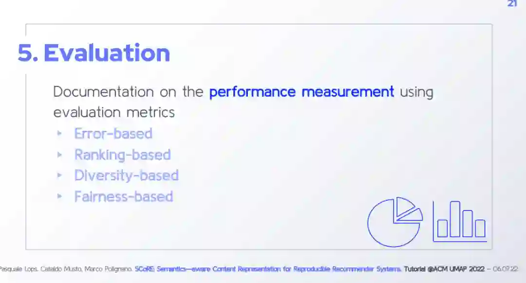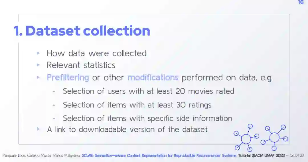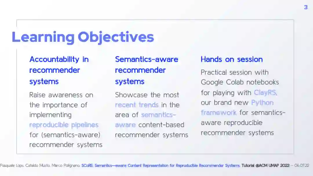 Architecture of the framework Focus on the Content Analyzer Module + Hands-on session TF-IDF and data pre-processing Word Embedding Techniques and Contextualized Word Representations Entity Linking Focus on the Recommendation Module + Hands-on session Strategies based on Neighborhoods Strategies based on Neural Networks Strategies based on Graphs Focus on the Evaluation Module + Hands-on session Focus on the Configuration Files and Graphical User Interface + Hands-on session