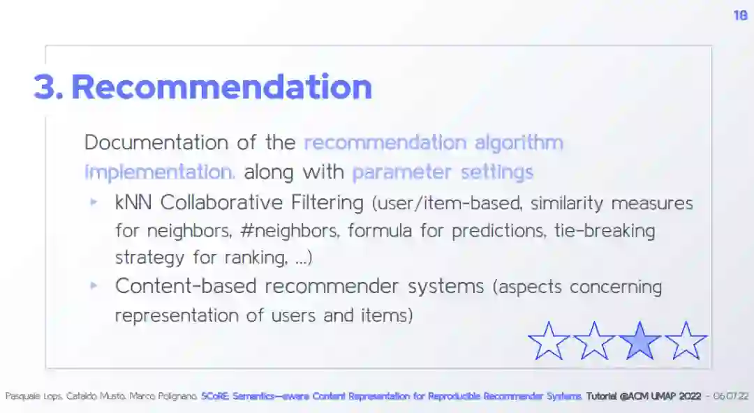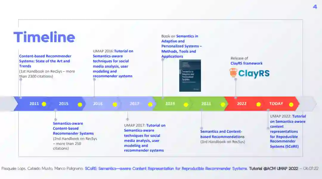 引言 Introduction (30 minutes)* Recommender Systems and the role of content Content representation: issues and challenges Towards accountable recommender systems Reproducibility and Replicability issues Frameworks for advanced content representations and accountability