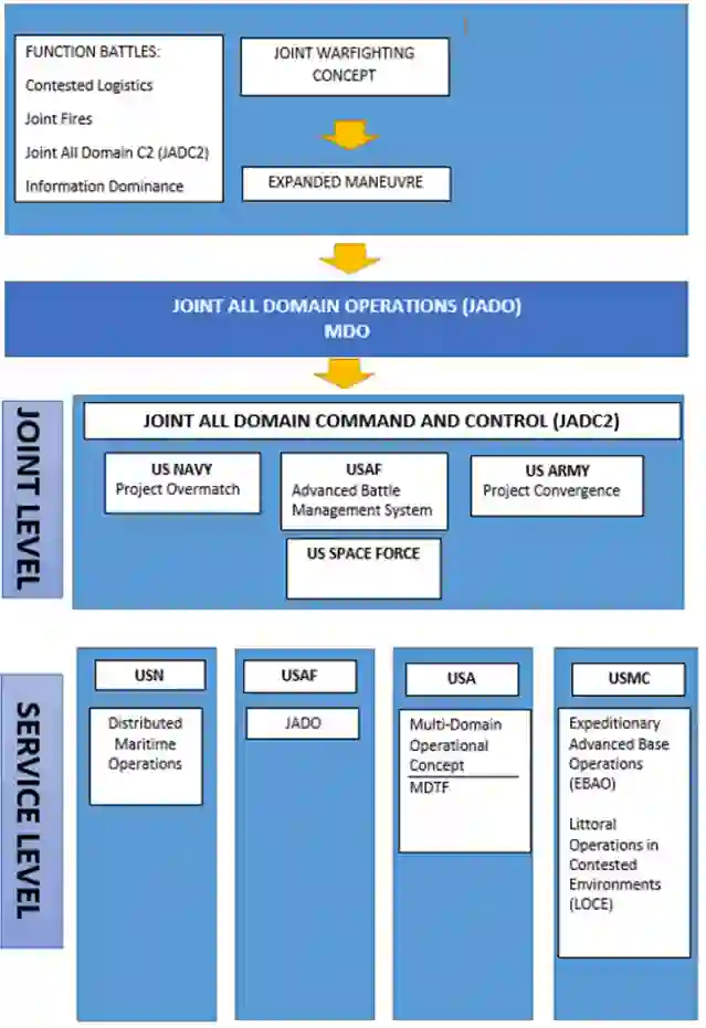 值得注意的是,在美国,联合层面的MDO被称为联合全域作战(JADO)。尽管MDO有联合要求,但在美国,每个军种都在MDO的指导下发展自己的作战概念和条令。根据计划,在作战期间,各军种将在一个名为联合全域指挥与控制(JADC2)的新C2网络架构下联系在一起。
