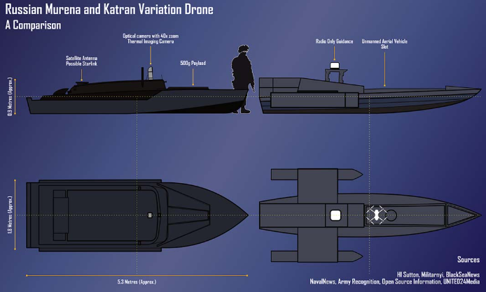 几个月后,俄罗斯国家技术集团的子公司——无人系统设计局中心也公布了其穆雷纳-300S设计。该无人水面艇尺寸与乌克兰的马古拉V和海宝贝相似,最高时速83公里,航程500公里。有趣的是,它安装了一个可能是星链天线的设备,制造商称之为在线抗干扰GNSS。穆雷纳-300S被宣传用于布雷、扫雷、巡逻和侦察。2025年7月,发布了西风号的改进版本,其前部船体增大,可能指向用于进攻的撞击装药。