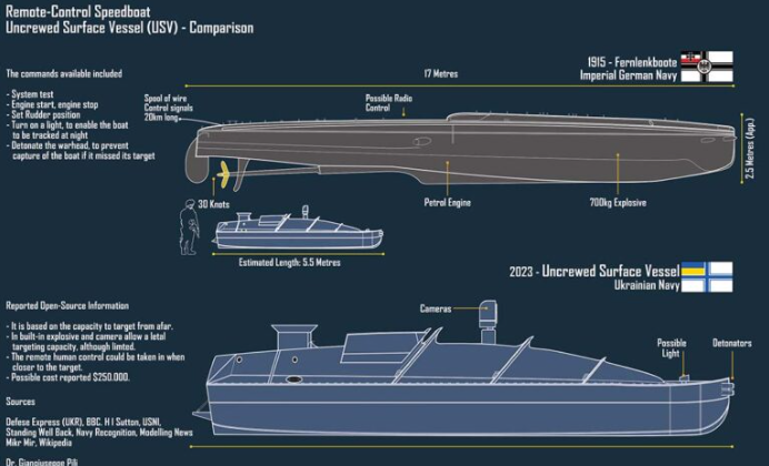 图2:德意志帝国海军1915年“费伦博特”遥控艇与乌克兰2023年“马古拉V3”USV的尺寸对比。
