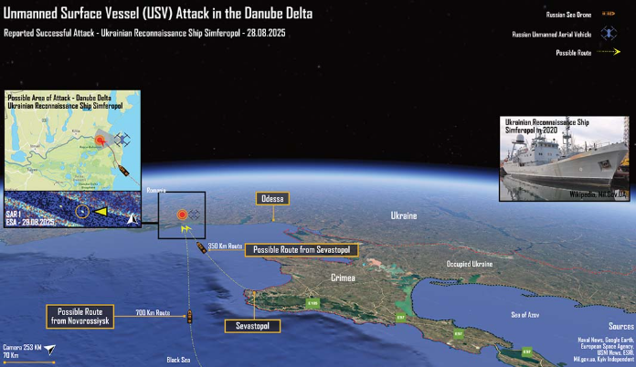 2025年8月28日,乌克兰辛菲罗波尔号中型侦察舰在多瑙河三角洲遭袭,据称是被一艘高速无人水面艇击中。该舰受损,一名船员丧生,另外两名受伤。俄罗斯消息源声称该舰已被击沉,乌克兰官员对此予以否认。此次袭击发生仅几周前,俄罗斯无人水面艇在波罗的海的七月风暴演习中进行了作战测试。这一事件标志着俄罗斯海上无人机有效进入战场,因为此前唯一有报道的部署是在2023年2月对敖德萨以南扎托卡桥的攻击中。然而,俄罗斯海上无人机的发展并不令人意外。这些海军资产与俄罗斯更广泛的海军战略高度契合,而且乌克兰自身也多次在战场上展示了其有效性,使其成为单向攻击无人水面艇开发和应用的领导者。