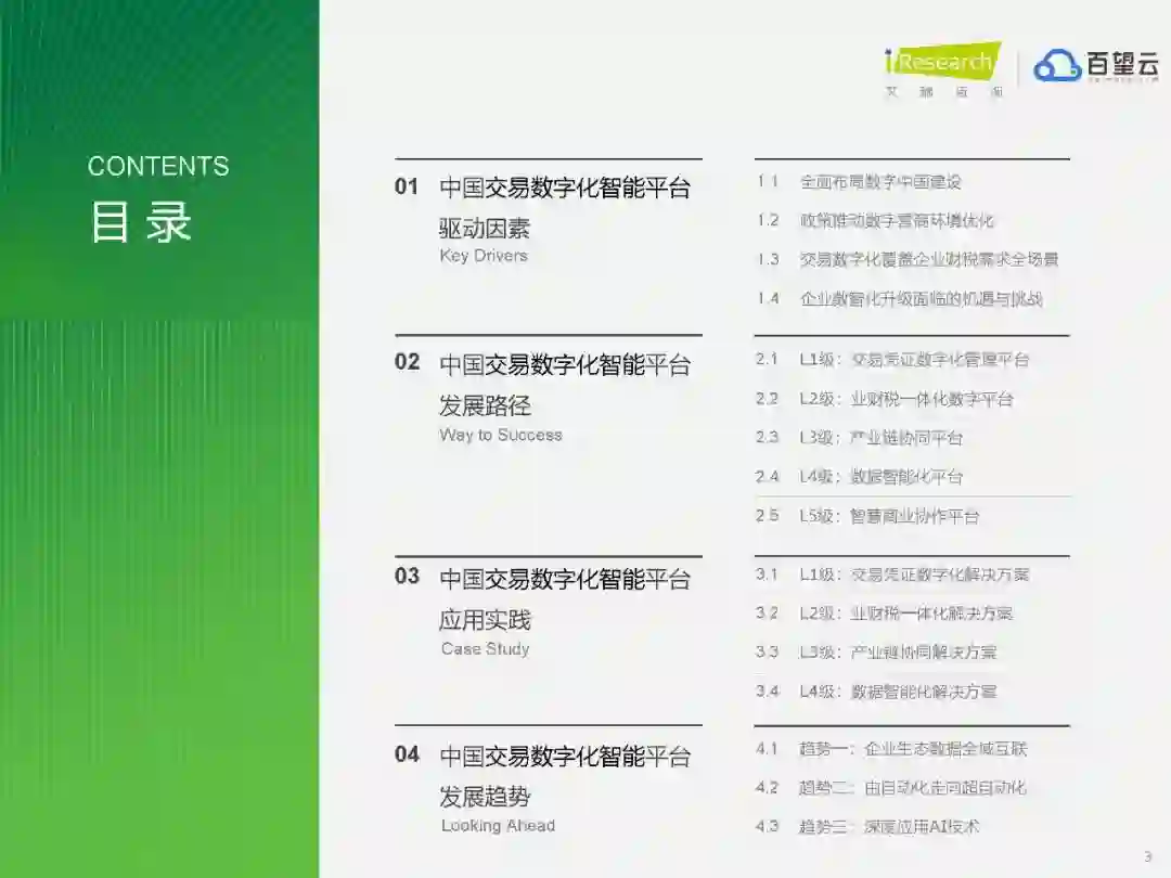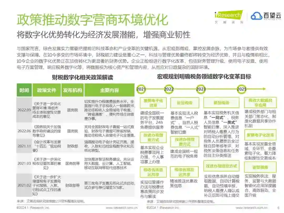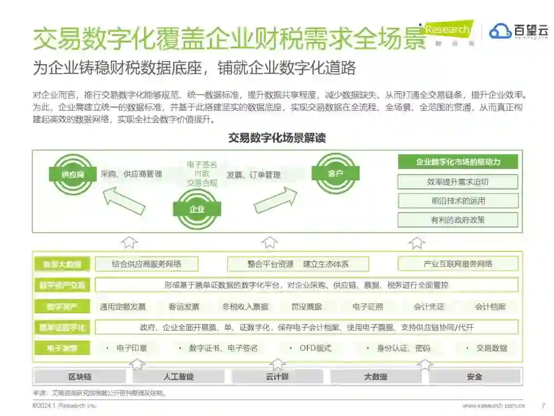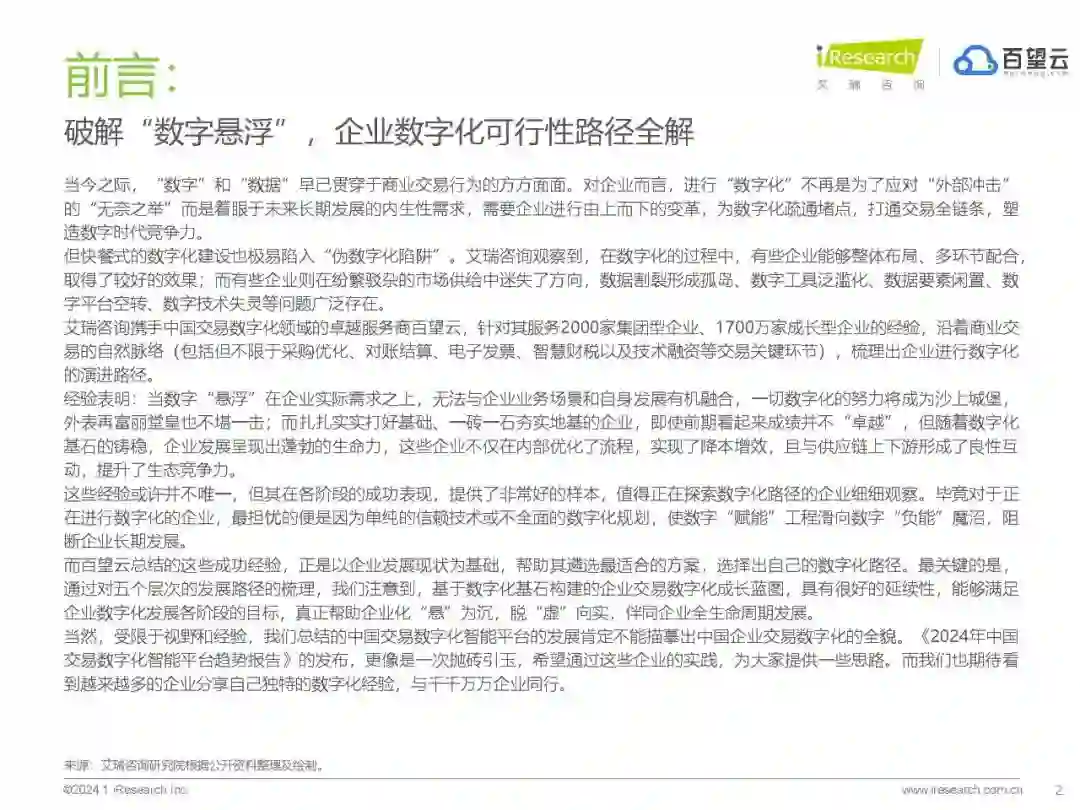 破解“数字悬浮”,企业数字化可行性路径全解 当今之际,“数字”和“数据”早已贯穿于商业交易行为的方方面面。对企业而言,进行“数字化”不再是为了应对“外部冲击”的“无奈之举”而是着眼于未来长期发展的内生性需求,需要企业进行由上而下的变革,为数字化疏通堵点,打通交易全链条,塑造数字时代竞争力。 但快餐式的数字化建设也极易陷入“伪数字化陷阱”。艾瑞咨询观察到,在数字化的过程中,有些企业能够整体布局、多环节配合,取得了较好的效果;而有些企业则在纷繁驳杂的市场供给中迷失了方向,数据割裂形成孤岛、数字工具泛滥化、数据要素闲置、数字平台空转、数字技术失灵等问题广泛存在。 艾瑞咨询携手中国交易数字化领域的卓越服务商百望云,针对其服务2000家集团型企业、1700万家成长型企业的经验,沿着商业交易的自然脉络(包括但不限于采购优化、对账结算、电子发票、智慧财税以及技术融资等交易关键环节),梳理出企业进行数字化的演进路径。 经验表明:当数字“悬浮”在企业实际需求之上,无法与企业业务场景和自身发展有机融合,一切数字化的努力将成为沙上城堡,外表再富丽堂皇也不堪一击;而扎扎实实打好基础、一砖一石夯实地基的企业,即使前期看起来成绩并不“卓越”,但随着数字化基石的铸稳,企业发展呈现出蓬勃的生命力,这些企业不仅在内部优化了流程,实现了降本增效,且与供应链上下游形成了良性互动,提升了生态竞争力。 这些经验或许并不唯一,但其在各阶段的成功表现,提供了非常好的样本,值得正在探索数字化路径的企业细细观察。毕竟对于正在进行数字化的企业,最担忧的便是因为单纯的信赖技术或不全面的数字化规划,使数字“赋能”工程滑向数字“负能”魔沼,阻断企业长期发展。 而百望云总结的这些成功经验,正是以企业发展现状为基础,帮助其遴选最适合的方案,选择出自己的数字化路径。最关键的是,通过对五个层次的发展路径的梳理,我们注意到,基于数字化基石构建的企业交易数字化成长蓝图,具有很好的延续性,能够满足企业数字化发展各阶段的目标,真正帮助企业化“悬”为沉,脱“虚”向实,伴同企业全生命周期发展。 当然,受限于视野和经验,我们总结的中国交易数字化智能平台的发展肯定不能描摹出中国企业交易数字化的全貌。《2024年中国交易数字化智能平台趋势报告》的发布,更像是一次抛砖引玉,希望通过这些企业的实践,为大家提供一些思路。而我们也期待看到越来越多的企业分享自己独特的数字化经验,与千千万万企业同行。https://data.eastmoney.com/report/zw_industry.jshtml?infocode=AP202402071621020052