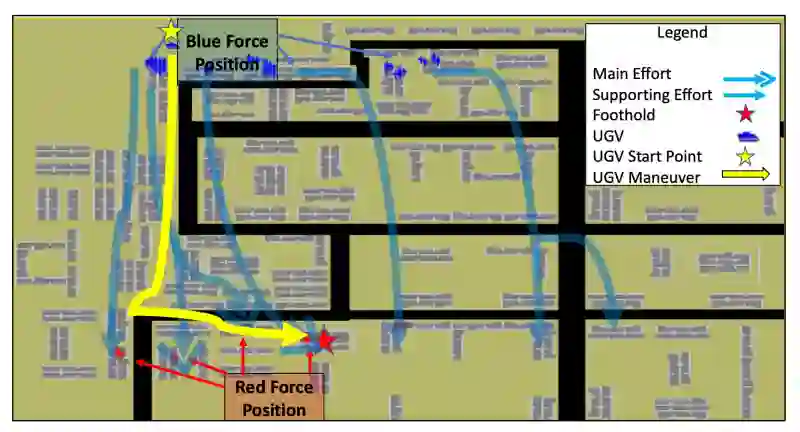 该作战模型包括两组主要的作战部队,以美国陆军的步兵作战顺序(ORBAT)为模型: (1)由装备有UGV的友军步兵连组成的蓝方部队;(2)由作为防御方的对手步兵排组成的红方部队。图1显示了模拟作战行动的一个迭代的开始状态。