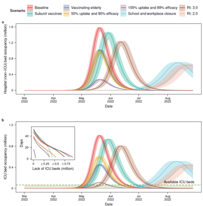 2021 年 11 月在南部非洲发现的 SARS-CoV-2 的 Omicron 变体已迅速传播到世界各地,并取代 Delta 变体成为全球主要毒株。Omicron 已证明相对于 Delta来说,免疫逃逸能力及传播能力有所提高**。连同对与先前感染和/或疫苗接种相关的感染的保护作用逐渐减弱,这些特征已导致大多数国家发生主要的 Omicron 流行病。 **尽管有迹象表明其临床严重程度可能低于 Delta,但 Omicron 感染的绝对数量已经使全球医疗系统紧张,包括美国和英国。**例如,在英国,Omicron 波导致的感染率高于 2021 年冬季的第二波,导致大量住院和死亡(2022 年 1 月 14 日至 2 月 4 日期间每周报告超过 1,000 人死亡)。**在 2020 年初在湖北控制了最初的流行病浪潮后,中国部署了多层非药物干预 (NPI) 方案来遏制主要来自国际旅行者的零星 COVID-19 暴发。**在整个大流行期间保持普通人群的低感染率使中国有时间对人群进行大规模免疫以抵抗 SARS-CoV-2。截至 2022 年 4 月 18 日,91.4% 的 3 岁以上人口已接受 COVID-19 疫苗接种的完整初级计划(以两剂方案施用的灭活疫苗,或以三剂方案施用的重组亚单位疫苗,或以单剂施用的重组腺病毒5型载体疫苗);其中 53.7% 的人接受了加强注射。**然而,疫苗诱导的人群免疫可能不足以预防 COVID-19 的爆发。从 2022 年 3 月 1 日到 4 月 22 日,中国几乎所有省份都报告了超过 500,000 例本地 Omicron 感染,其中大部分(约 93%)发生在上海。为了遏制具有高度传染性和免疫规避性的 Omicron 变体,将需要采取额外的 NPI 措施来维持动态清零政策。