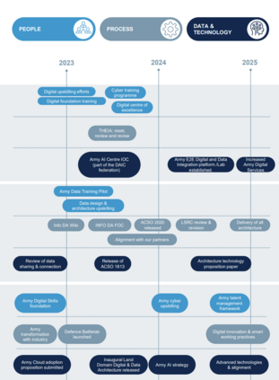 该计划以新的陆军作战模式(AOM)下已在进行的转型为基础,引入了部队和能力的 “设计授权”(以部队为中心的能力管理(FCCM))。新的 “设计授权”的重点是了解端到端的企业和作战流程,通过数字化确定优先次序并提高效率,以及管理、利用和共享我们的关键数据,从而越来越多地以机器速度发挥作战优势。