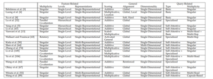 **基于特定的一组输入数据,特征模型提取特征向量,从而使注意力模型能够关注这些不同的向量。这些特征可能具有特定的结构,需要特殊的注意力机制来处理它们。可以对这些机制进行分类,以处理以下特征特征之一: 特征的多样性、特征的级别或特征的表示。