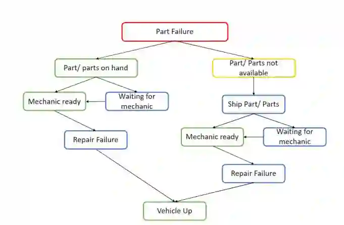 图 2:决策树: 该图展示了当一个部件发生故障时机械师将经历的过程。它概述了我们模拟背后的功能和概念。虽然车辆或部件出现故障后还必须进行许多其他活动,但该流程图概述了在使用和不使用预测器的情况下模拟维护流程时的步骤。