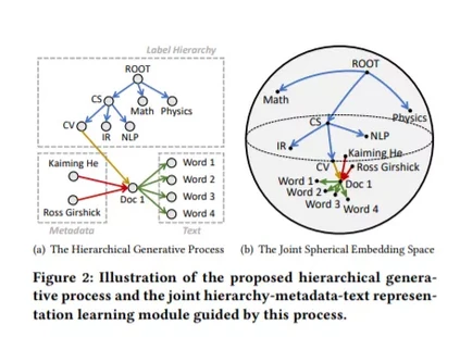 由于层次主题结构在海量文本语料库中普遍存在,将文档分类到给定的标签层次结构直观上很有吸引力。虽然相关研究在全监督层次文档分类方面取得了令人满意的效果,但通常需要大量的人工标注训练数据,且只利用文本信息。但在很多领域,(1)标注代价很高,可以获取的训练样本很少;(2)文档伴随元数据信息。因此,本文研究弱监管下如何整合标签层次结构、元数据和文本信号进行文档分类。我们开发了HiMeCat,一个基于嵌入的生成框架用于我们的任务。具体地说,我们提出了一种新的联合表示学习模块,它允许对类别相关性、元数据信息和文本语义进行同步建模,我们的实验证明了HiMeCat在Baseline上的持续改进,并验证了我们的表示学习和数据增强模块的贡献。