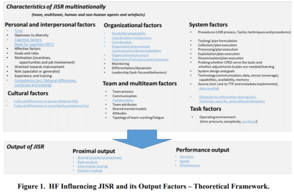 北约 HFM-276 任务小组使用组织有效性模型制定了一套调查,以确定和了解对有效的 ISR 行动至关重要的HF问题。该模型的核心是由任务分配、收集、处理、利用和传播(TCPED)组成的联合监查制度流程。从这一模型和其他来源得出的数据收集计划审视了一些HF问题在整个 ISR 行动中的作用:基本HF知识、态势评估、工作量、组织结构、信任、信息共享、信息管理、领导力、文化、组织流程、组织灵活性、共同意识和责任、协调和协调机制、决策、能力、情报需求管理(IRM)、通信、元数据和应用系统。所有这些HF因素都将影响 ISR 的作战概念,并影响操作人员的绩效。此外,本文还总结了改进北约和非北约行动 ISR CD&E 流程的一些实际意义,重点是开发应纳入 ISR CD&E 流程的HF研究方法。这种HF方法就像 ISR 概念开发的技术和程序质量控制部分。预计研究结果将有助于为 ISR 指挥系统各级的政策和决策者提供信息和建议,以加强北约 ISR 规划、任务执行和能力发展方面的信息和决策优势。预计研究结果还将有助于为 ISR 与其他联合进程(如联合目标定位)的整合提供信息,以确定当前与 ISR 有关的HF差距以及与其他进程的整合。