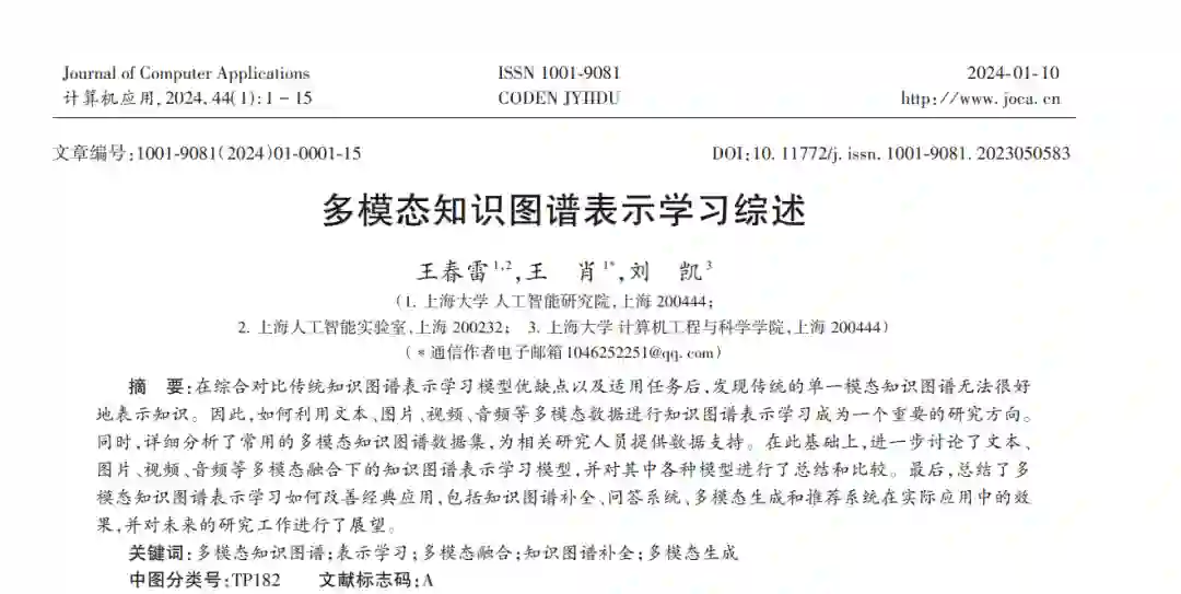 在综合对比传统知识图谱表示学习模型优缺点以及适用任务后,发现传统的单一模态知识图谱无法很好地表示知识。因此,如何利用文本、图片、视频、音频等多模态数据进行知识图谱表示学习成为一个重要的研究方向。同时,详细分析了常用的多模态知识图谱数据集,为相关研究人员提供数据支持。在此基础上,进一步讨论了文本、图片、视频、音频等多模态融合下的知识图谱表示学习模型,并对其中各种模型进行了总结和比较。最后,总结了多模态知识图谱表示学习如何改善经典应用,包括知识图谱补全、问答系统、多模态生成和推荐系统在实际应用中的效果,并对未来的研究工作进行了展望。 “模态”(Modality)是德国理学家赫尔姆霍茨提出的生物学概念,指的是将多种感官信息进行融合,包括嗅觉、味觉、视觉、听觉和触觉等。随着互联网的普及和大数据的发展,不同模态的数据不断涌现,多模态知识图谱表示学习的发展在人工智能领域中引起了广泛关注。目前大多数研究主要针对单一模态的文本,然而,只有对不同模态数据的研究相互辅佐才能使知识的表示更完善。在人工智能领域中,多模态往往指感知信息,如图像、文本、语音和音频等,通过对这些多模态信息的综合理解,可以帮助人工智能更准确地理解外部世界。 知识图谱由Google公司于2012年提出[1],是知识表示的一种方法。最初,它是以文本形式表示实体关系属性的三元组,但在机器描述和理解世界的能力方面存在缺陷。随着机器视觉和多模态学习研究的推进,研究人员发现结合视觉可以更好地为图谱中的实体进行相关表示学习,而多模态研究的最早例子之一是视听语音识别(Audio-Visual Speech Recognition, AVSR)[2]。 随着多模态研究的逐渐深入,从单一模态的表示学习逐渐发展为多模态的表示学习。早期的知识图谱表示学习模型主要学习基于实体和关系的结构信息,忽略了其他模态数据类型的实体知识。近年来的相关研究工作表明,从实体的图像和文本描述中可以获得丰富的补充知识,在知识图谱补全和三元组分类工作中发挥重要作用[3]。同样,在关系提取任务中,附加图像通常会大幅提高属性和关系的性能。因此,融合各类模态的数据可以更好地对知识进行表示学习,以推动更多相关的典型任务。多模态知识图谱表示学习与应用的研究已经成为必然的趋势。