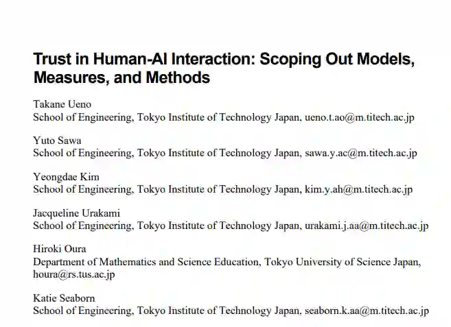 信任被认为是人与人之间,以及人与机器之间人际关系的一个重要因素。来自不同学科的研究人员已经研究了信任在调解个人之间、个人与组织之间、甚至组织之间关系中的作用[27]。但是,信任的重要性并不限于人与人之间的互动;它也被强调为人与计算机[32,46,48]、人与机器人[9,19,39,45]以及人与自动化[21,27,36]之间的关键因素。最近关于人们与人工智能技术互动的工作表明,信任需要更多关注。例如,一项调查发现,许多人对基于人工智能的技术有负面印象,48%的美国人表示他们永远不会坐上自动驾驶汽车[50]。日本的一项研究表明,平均而言,超过57%的人对在工作场所与人工智能合作感到不舒服[35]。这种对人工智能的犹豫不决可能有多种来源。一个可能是人工智能的独特性质。机器学习(ML)是当前人工智能技术的核心,由算法和数据训练组成:这种黑盒式的、不透明的状态导致了对可解释人工智能或XAI的呼吁[5]。此外,ML可能涉及到用新的数据进行重新学习,并不总是从相同的输入产生相同的输出。具备 "思想 "的人工智能可以像人的思想一样不可知和不可预测,这使得与人工智能注入的系统的互动成为信任的问题。事实上,从早期开始,信任就是人工智能相关会议的一个重要主题,尤其是最近,它已经成为人与人工智能互动(HAII)研究中的一个关键词[3]。