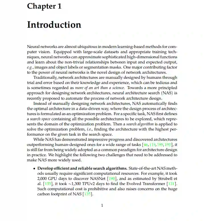 神经架构搜索(NAS)是最近提出的一种自动设计网络架构的方法。NAS不是手动设计网络架构,而是以数据驱动的方式自动找到最佳架构。尽管NAS取得了令人印象深刻的进展,但在实践中仍远未被广泛采用为架构设计的通用范式。本文旨在开发有原则的NAS方法,可以自动化神经网络的设计,并尽可能减少人工在架构调优方面的工作。为了实现这一目标,我们专注于开发更好的搜索算法和搜索空间,这两者对NAS的性能都很重要。