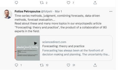 简而言之,这是预测领域的一个激动人心的时代,所有新的理论发展和预测在实践中的应用。预测是如此普遍,以至于不可能在一篇文章中涵盖所有这些发展。本文设法涵盖了相当多的内容,而且种类繁多。对每种方法进行简短的介绍,由对理论主题或实践领域“接近实际”的专家来做,可以很好地提供预测理论和实践的最新状况。