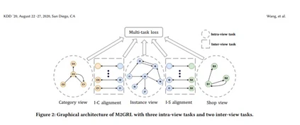 将图表示学习与多视图数据(边信息)相结合进行推荐是行业发展的趋势。现有的方法大多可以归类为多视图表示融合;他们首先构建一个图,然后将多视图数据集成到图中每个节点的一个紧凑表示中。然而,这些方法在工程和算法方面都引起了关注:1)多视图数据在工业中是丰富的,信息量大,可能超过单个向量的容量,2)由于多视图数据往往来自不同的分布,可能会引入归纳偏差。在本文中,我们使用一种多视图表示对齐方法来解决这个问题。特别地,我们提出了一个多任务多视图图表示学习框架(M2GRL)来学习网络规模推荐系统的多视图图的节点表示。M2GRL为每个单视图数据构造一个图,从多个图中学习多个单独的表示,并对跨视图关系进行对齐。M2GRL选择多任务学习范式,共同学习视图内表示和跨视图关系。此外,M2GRL利用同方差不确定性自适应调整训练任务的权重损失。我们在淘宝上部署了M2GRL,并在570亿个例子上训练它。根据离线指标和在线A/B测试,M2GRL的性能显著优于其他最先进的算法。淘宝多样性推荐的进一步探索表明了利用所产生的多种表示的有效性,我们认为这对于不同焦点的行业推荐任务是一个很有前景的方向。