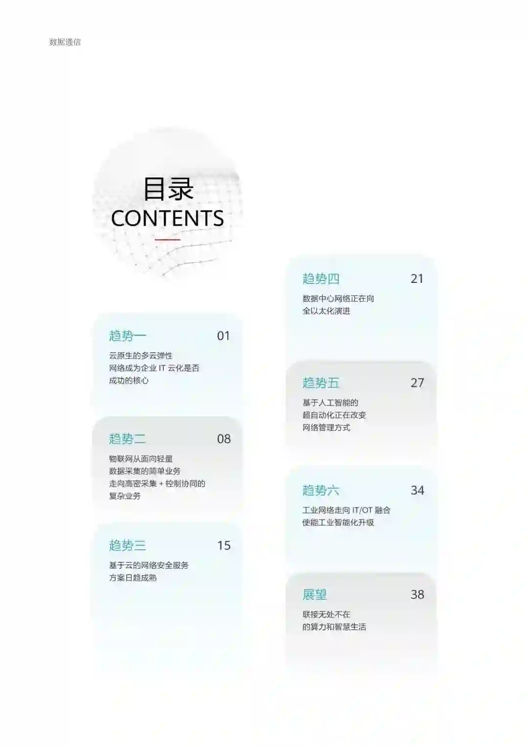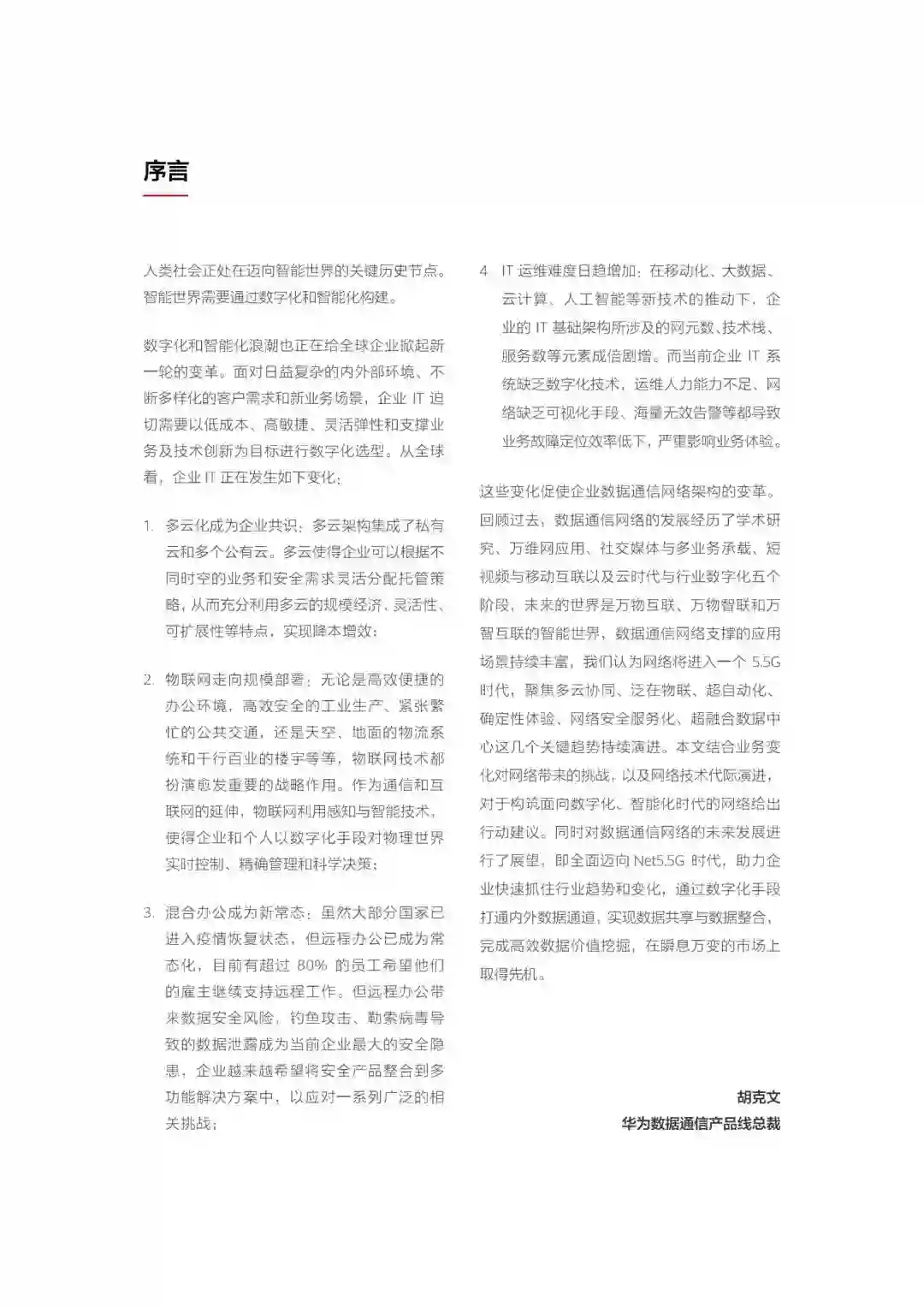 这些变化促使企业数据通信网络架构的变革。回顾过去,数据通信网络的发展经历了学术研究、万维网应用、社交媒体与多业务承载、短视频与移动互联以及云时代与行业数字化五个阶段,未来的世界是万物互联、万物智联和万智互联的智能世界,数据通信网络支撑的应用场景持续丰富,我们认为网络将进入一个5.5G时代,聚焦多云协同、泛在物联、超自动化、确定性体验、网络安全服务化、超融合数据中心这几个关键趋势持续演进。本文结合业务变化对网络带来的挑战,以及网络技术代际演进,对于构筑面向数字化、智能化时代的网络给出行动建议。同时对数据通信网络的未来发展进行了展望,即全面迈向Net5.5G时代,助力企业快速抓住行业趋势和变化,通过数字化手段打通内外数据通道,实现数据共享与数据整合,完成高效数据价值挖掘,在瞬息万变的市场上取得先机。