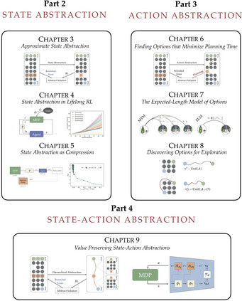 第4部分。最后,我转向状态动作抽象的联合过程。在第9章中,我介绍了一个将状态和动作抽象结合在一起的简单机制。使用这个方案,然后我证明了哪些状态和动作抽象的组合可以在任何有限的MDP中保持良好的行为策略的表示,定理9.1总结了这一点。接下来,我将研究这些联合抽象的反复应用,作为构建分层抽象的机制。在对层次结构和底层状态动作抽象的温和假设下,我证明了这些层次结构也可以保持全局近最优行为策略的表示,如定理9.3所述。然后,我将在第十章中总结我的思考和今后的方向。