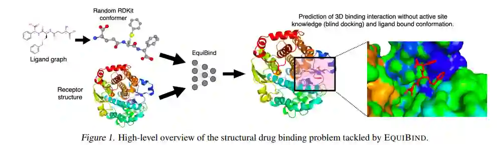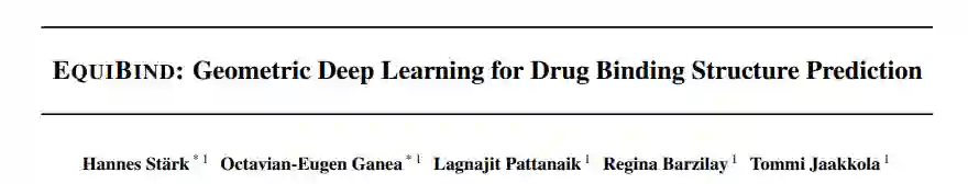 预测类药物分子如何与特定的蛋白质靶点结合是药物发现中的一个核心问题。一个极其快速的计算结合方法将使快速虚拟筛选或药物工程等关键应用成为可能。现有的方法在计算上是昂贵的,因为它们依赖于大量的候选样本,再加上评分、排名和微调步骤。我们用EQUIBIND挑战这种模式,它是一个SE(3)等价几何深度学习模型,对i)受体结合位置(盲对接)和ii)配体的结合姿势和方向进行直接拍摄预测。与传统和最近的基线相比,EquiBind实现了显著的速度提升和更好的质量。此外,我们显示,当它与现有的微调技术相结合时,以增加运行时间为代价,有了额外的改进。最后,我们提出了一个新的快速微调模型,该模型基于冯-米塞斯角距离与给定输入原子点云的全局最小值来调整配体的可旋转键的扭转角,避免了以前昂贵的能量最小化的差分进化策略。
