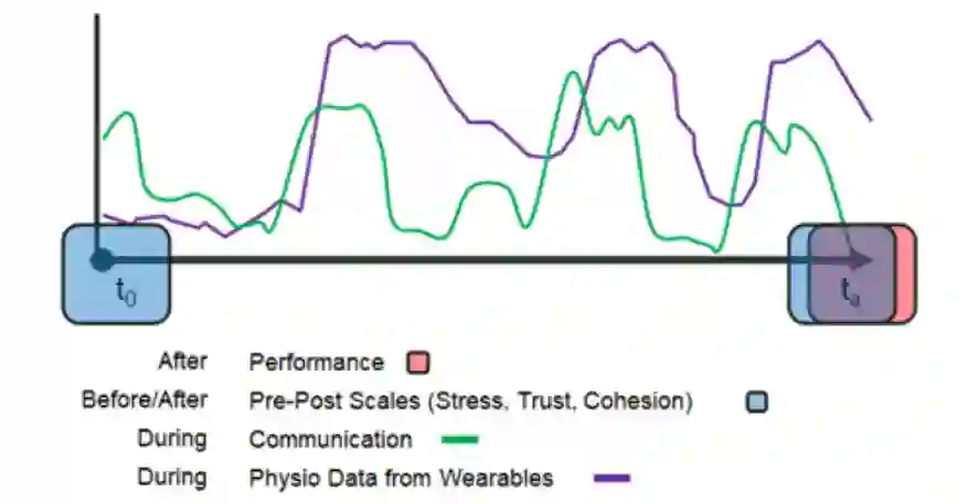 图1 包括压力、信任和凝聚力在内的事前事后主观状态的多模态数据表示,数据流来自通信指标和生理数据