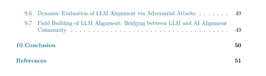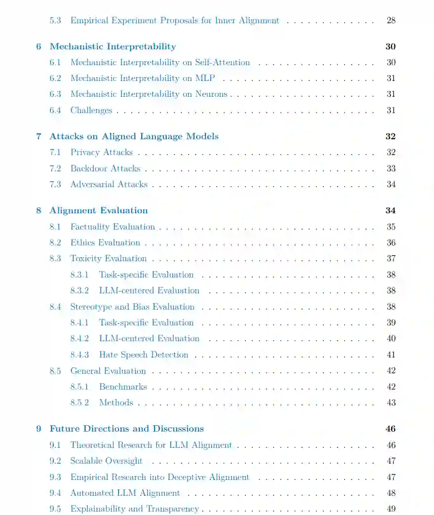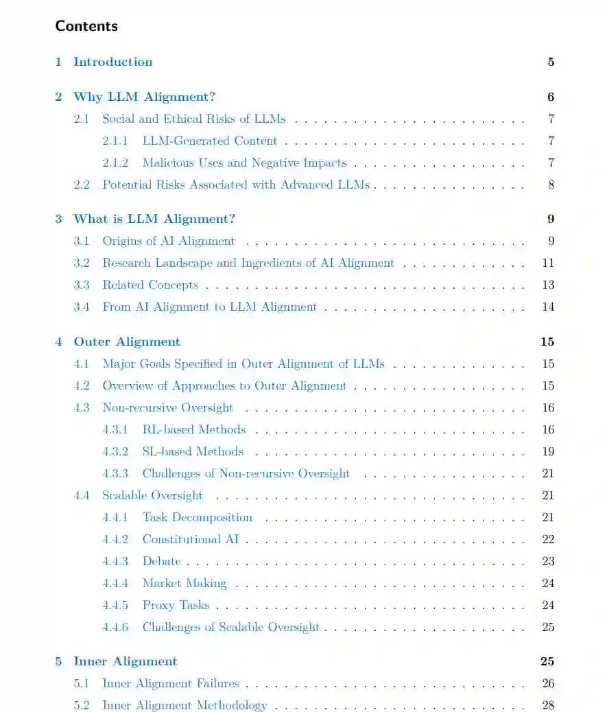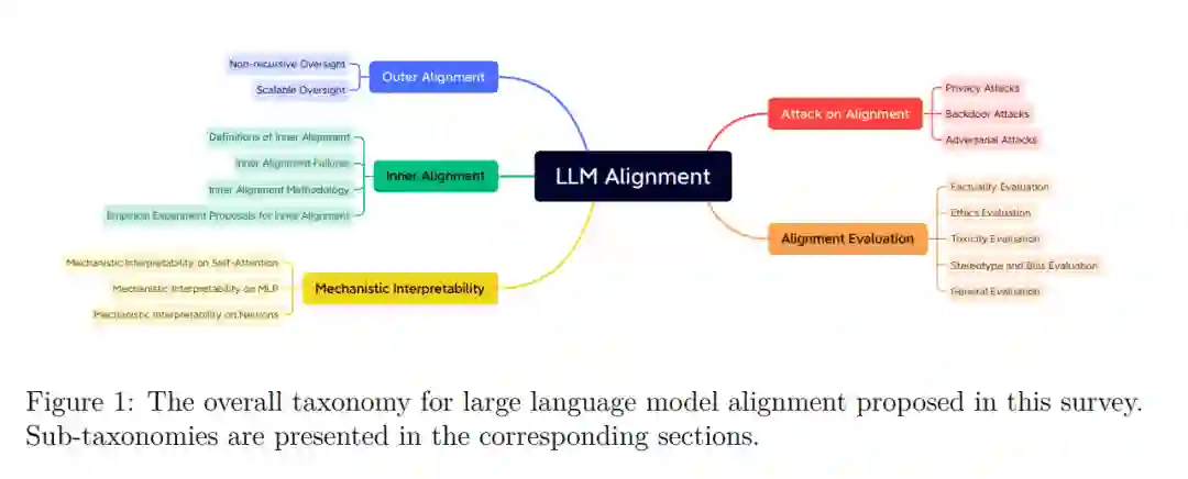 为了弥补这一差距,我们从AI对齐的角度提供了LLM对齐的全面概述。我们认为,对齐的全面理解不仅应该包括广泛研究的外部对齐,还应该深入探讨目前还处于起步阶段的领域。诸如内部对齐和机械解释性这样的主题,虽然目前还处于研究的初级阶段,但却拥有巨大的潜力。在这个阶段,这些领域的许多提案仍然是理论性的,或者仅仅是思考实验。然而,我们认为,它们对LLM对齐研究的未来轨迹是不可或缺的。通过揭示这些被忽视的领域,我们希望呈现出一个更为全面的对齐视角。因此,除了现有的LLM对齐方法,我们还将介绍几个对齐主题,尽管这些主题尚未应用于LLMs,但显示出前景,并可能在可预见的未来成为LLM对齐的组成部分。通过这样做,我们致力于丰富AI对齐及其在大型语言模型领域的多方面应用的论述。
