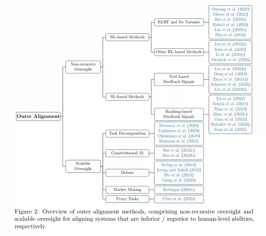 响应这一领域日益增长的兴趣,最近有一些文章回顾了(或偶然讨论了)LLMs的对齐方法(Pan等,2023年;Zhao等,2023b年;Fernandes等,2023年;Liu等,2023d年;Wang等,2023d年)。然而,一个值得注意的观察是,这些评论主要集中在外部对齐上,常常忽略了AI对齐中的其他重要主题,如内部对齐和机械解释性。虽然无可否认,外部对齐在LLM对齐中占据了关键地位,并且一直是深入和深刻研究的主题,但从更广泛的AI对齐角度来看,它只是整个对齐景观的一部分。