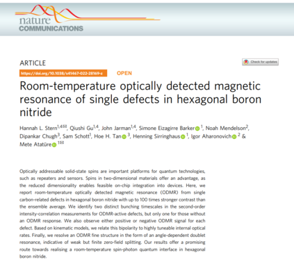 监督这项工作的 Mete Atature 教授补充说:“既然我们已经在这种材料中确定了室温下光学可访问的孤立自旋,下一步将是详细了解它们的光物理学,并探索可能应用的操作机制,包括信息存储和量子传感。这项工作之后将会有一系列有趣的物理学。”