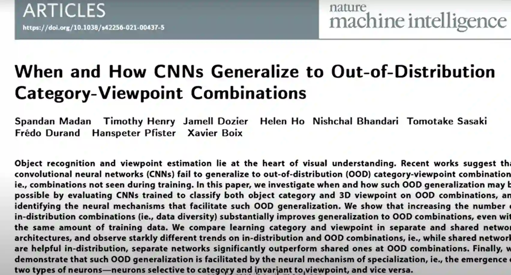 Nature Machine Intelligence:When and how convolutional neural networks generalize to out-of-distribution category–viewpoint combinations(卷积神经网络何时以及如何推广到非分布的分类视点组合)