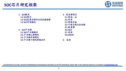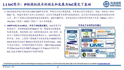 片上系统SoC(SystemonChip),即在一块芯片上集成一整个信息处理系统,简单来说SoC芯片是在中央处理器CPU的基础上扩展音视频功能和专用接口的超大规模集成电路,是智能设备的“大脑”。   应用处理器AP(ApplicationProcessor)是SoC中包含CPU在内的所有计算芯片的集成物。智能手机SoC通常包含AP和基带处理器BP等,AP负责应用程序的运行,BP负责收发无线信号。有时将AP和SoC混用。   随着半导体工艺的发展,传统MCU已经不能完全满足智能终端的需求,SoC应运而生,凭借其性能强、功耗低、灵活度高的特点,使单芯片能够完成完整的电子系统。SoC在移动计算(例如智能手机和平板电脑)和边缘计算市场中非常普遍。它们也常用于嵌入式系统,如WiFi路由器和物联网。   当前SoC已成为功能最丰富的硬件,集成了CPU、GPU、RAM、ADC、DAC、Modem、高速DSP等各个功能模块,部分SoC还集成了电源管理模块、各种外部设备的控制模块,同时还需要考虑各总线的分布利用等。   1.1SoC简介:IP核是构成SoC的基本单元   IP核(IntellectualPropertyCore),即知识产权核,在集成电路设计行业中指已验证、可重复利用、具有某种确定功能的芯片设计模块。SoC是以IP模块为基础的设计技术,IP是SoC应用的基础。   IP核可以划分为CPU、GPU、DSP、VPU、总线、接口等6个类别,也可按软核、固核、硬核分类。   1.1SoC简介:IP核授权技术的诞生和发展为SoC奠定了基础   SoC的概念和设计技术始于20世纪90年代中期。早期芯片设计难度较低,半导体公司多为集设计、制造、封测为一体的IDM厂商。随着半导体产业和工艺的进步,往后芯片随着摩尔定律不断更新迭代,晶片设计和制造的成本和难度均大幅上升,单一厂商难以承担高额研发及制造费用。20世纪80年代,台积电的成立不断引导半导体产业朝“Fabless(设计)+Foundry(制造)+OSAT(封测)”分工方向发展。   1990年IP龙头Arm诞生,开创了IP核授权模式。Arm负责芯片架构设计,并将IP核授权给Fabless厂商。随着超大规模集成电路的发展,集成电路(IC)逐渐向集成系统(IS)转变,IC设计厂商趋向于将复杂功能集成到单硅片上,SoC的概念逐渐形成。例如,三星等厂商根据产品需求将基于ARM架构的CPU处理器和各类外围IP组合得到包含许多组件的SoC,根据不同应用需求,内部组件封装不尽相同。1994年Motorola发布的FlexCore系统和1995年LSILogic公司为Sony公司设计的SoC,是基于IP核完成SoC设计的最早报导。