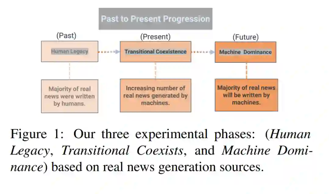 最后,在“机器主导”阶段,我们模拟了一个可能的未来,即机器生成的文本在真实新闻生成中激增。为此,真实新闻类别的训练数据完全来源于机器生成的真实新闻文章。这一阶段设想了一个场景,即LLMs凭借其先进的能力成为新闻生成的主要和主导来源。