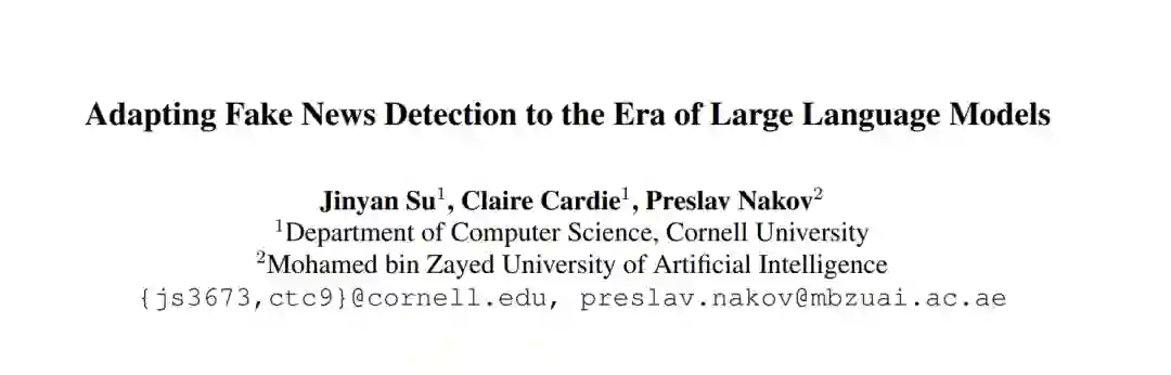 为了适应大型语言模型(LLMs)时代,下一代假新闻检测器应能够处理人类/机器生成的真/假新闻的混合内容环境。虽然存在大量关于假新闻检测的研究,但它们通常专注于人类撰写的假新闻(Khattar et al., 2019; Kim et al., 2018; Paschalides et al., 2019; Horne and Adali, 2017; Pérez-Rosas et al., 2018)或机器生成的假新闻(Zellers et al., 2019; Goldstein et al., 2023; Zhou et al., 2023),基本上将问题框定为检测机器生成的文本。然而,健壮的假新闻检测器应主要评估新闻文章的真实性,而不是依赖于其他混杂因素,比如文章是否是机器生成的。因此,迫切需要理解机器转述的真实新闻(MR)、机器生成的假新闻(MF)、人类撰写的假新闻(HF)和人类撰写的真实新闻(HR)上的假新闻检测器。