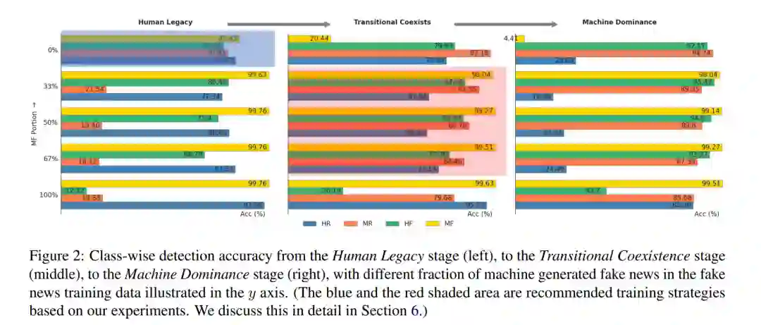 过渡共存设置。在这种设置中,真实新闻类别的训练数据由机器生成和人类撰写的文章平等组成。值得注意的是,当假新闻训练数据完全由人类撰写时,MF子类的准确度相对较低,仅为20.44%,而HF类别的检测准确度高达79.93%。相反,当假新闻类别完全是MF时,HF子类的准确度降低到仅26.19%,而MF的准确度很高。回顾我们之前在人类遗产阶段的分析,这可能归因于检测器利用指示文章来源(机器或人类)而非其真实性的特征。在训练数据中没有HF的情况下,检测器可能会采取捷径,假设所有假新闻都是机器生成的,从而导致HF子类的准确度降低。当训练期间没有MF数据时,也可能出现类似情况,这可能导致检测器在测试时将MF文章错误分类为真实新闻。此外,即使假新闻类别中含有一半MF和一半HF,MF子类的检测准确度始终超过其他子类,而HR的准确度最低。这种检测准确度并不像仅在HF和HR上训练那样平衡(参见人类遗产阶段MF部分为0%的结果,蓝色阴影区域)。这突出了一个关键见解:在训练期间努力实现每个子类的完美平衡可能不会产生像仅在人类生成的真假新闻上训练那样好的结果。然而,由于与其他三个子类(HR、HF、MF)的训练结果比纯粹在人类撰写的真假新闻上训练的结果更好,整体性能可能会更好(取决于测试集中的子类分布)。
