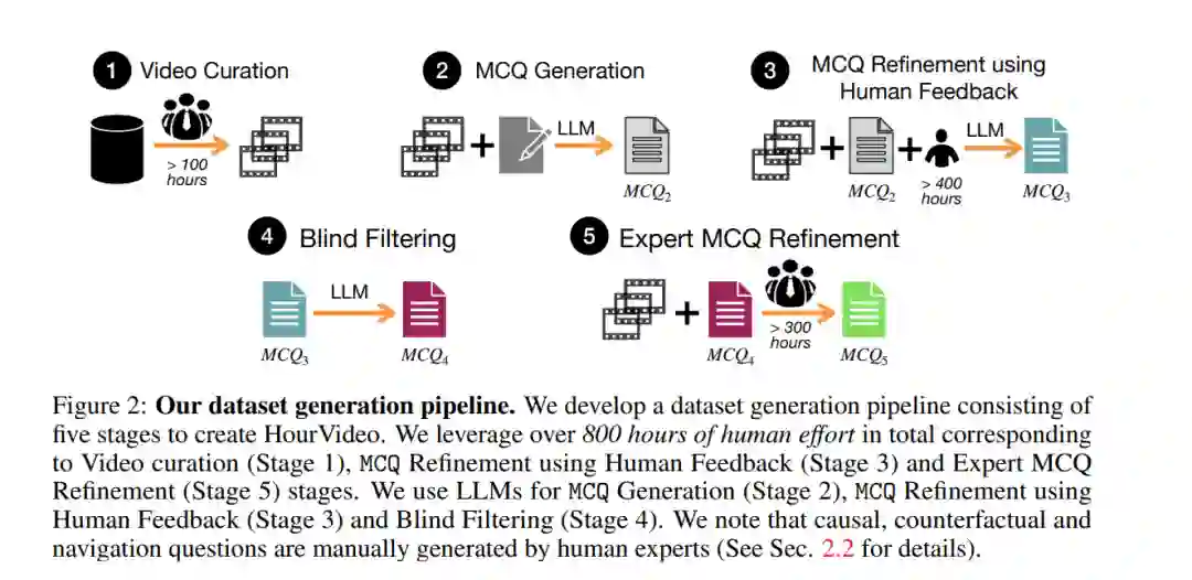 我们介绍了 HourVideo,一个用于小时级视频-语言理解的基准数据集。该数据集包含一个全新的任务套件,涵盖了摘要生成、感知(回忆、跟踪)、视觉推理(空间、时间、预测、因果、反事实)以及导航(从房间到房间、对象检索)任务。HourVideo 包含了从 Ego4D 数据集中精心挑选的500个第一人称视频,时长从20分钟到120分钟不等,涵盖了12,976道高质量的五选一多项选择题。基准测试结果显示,多模态模型(包括 GPT-4 和 LLaVA-NeXT)仅比随机猜测略有提升。与之形成鲜明对比的是,人类专家的表现显著优于当前最先进的长上下文多模态模型 Gemini Pro 1.5(85.0% 对比 37.3%),这突显出多模态能力上的巨大差距。我们的基准数据集、评估工具包、提示和文档已在 hourvideo.stanford.edu 上发布。