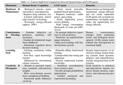 大型语言模型迅速融入智能体架构,推动人工智能飞速发展,也凸显出AI系统与人类认知之间的根本差异。如表 1.1 所示,在“硬件”基础、意识状态、学习方式、创造力与能效等维度上,基于LLM的智能体与人类认知存在显著不同。然而,这种比较仅提供了一个高层次的概览,远非对人类智能的全面刻画,同时也未能穷尽AI智能体所具备的全部特性。 人类智能运行于生物硬件——大脑之上,其能效极高,能够以极低的代谢成本实现终身学习、推理与适应性决策。而当前AI系统则依赖高计算资源,在执行类似认知任务时能源消耗显著更高。这一性能差异突显了“能效”作为未来AI研究的重要突破口。 在意识与情感体验方面,LLM智能体缺乏真正的主观状态与自我意识,这是人类认知不可或缺的一部分。虽然复制人类意识在AI中可能既非必要也非理想目标,但理解情感与主观体验在推理、动机、伦理判断与社会互动中的核心作用,有助于引导AI研究朝着更具对齐性、可信性与社会价值的方向发展。 人类的学习过程是持续性的、交互性的,并强烈受社会、文化与经验因素影响。而LLM智能体的训练方式主要为离线的大规模批量训练,其持续适应能力有限。尽管诸如指令微调(instruction tuning)与人类反馈强化学习(RLHF)[12] 等方法有所改善,当前的LLM智能体仍未达到人类那样的灵活性。终身学习、个性化适应与交互式微调等方向被认为是实现更高类人适应性的关键研究路径。 人类的创造力源于个体经验、情感洞察与跨领域联想的复杂交织;而LLM的“创造”更多表现为对已有数据的统计重组——即所谓的“统计式创造力”,在深度、原创性与情感共鸣方面仍有差距。这一差异提示我们,可通过引入更丰富的上下文理解、模拟情感状态与经验基础,来推动更深层次的AI创造力发展。 从时间尺度来看,人类大脑经过数百万年的自然选择与环境适应才形成了今日的高效、灵活与创造力,而AI智能体的技术发展不过80年,自最初的计算机模型起步至今。这种人类认知与AI系统的并行比较极具价值,不仅揭示了它们之间的类比与根本差异,也为未来AI智能体技术的发展提供了有益的指导。 最终,从人类智能中汲取灵感,将有望进一步提升AI能力,造福医疗、教育、可持续发展等多个关键领域,为人类社会带来广泛的积极影响。