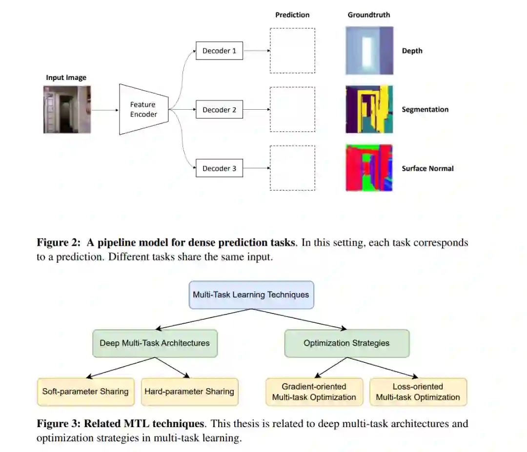 1.2 多任务学习 多任务学习(MTL)的目标是通过挖掘任务间的共享知识来提升多个相关学习任务的整体性能。多任务学习相较于单任务学习的关键优势在于它能够在相关任务之间共享表示,这可以提高学习效率,并通过联合学习任务的正则化效果提升模型在单个任务上的性能 [27, 240]。多任务学习已在自然语言处理 [31, 120, 148]、计算机视觉 [88, 122, 195]和强化学习 [49, 171]等多个领域成功应用。我们的研究重点是计算机视觉中的多任务学习。