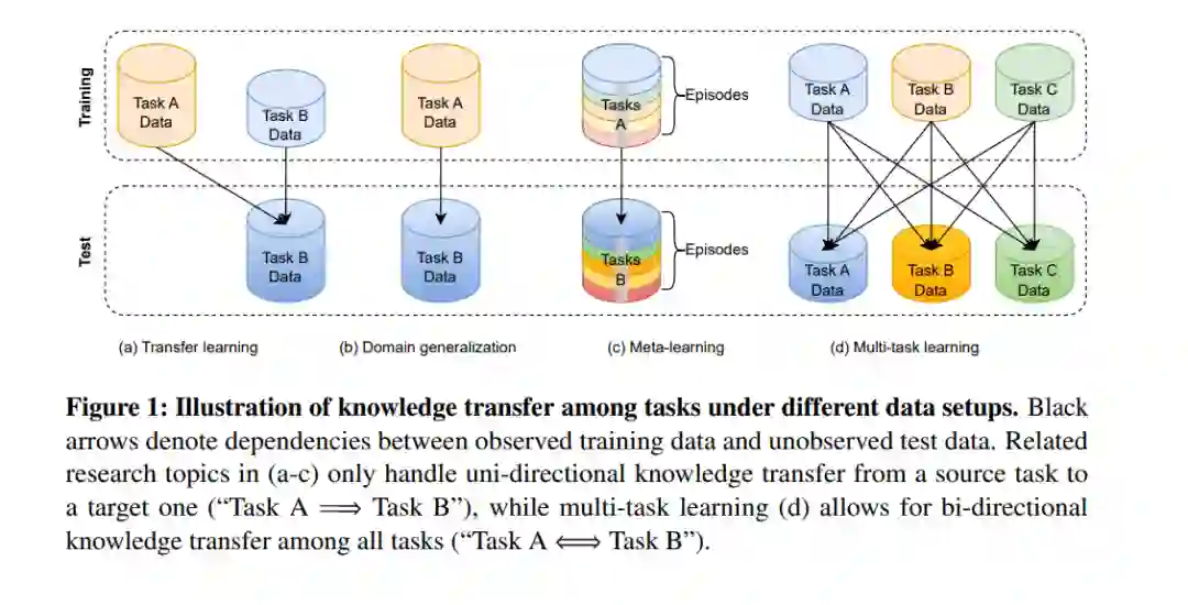 人工智能(AI)和机器学习(ML)已经改变了许多行业。在医疗保健领域,AI和ML促进了诊断工具的增强 [105],帮助识别患者数据模式,并支持外科手术操作。在交通领域,配备AI和ML的自动驾驶车辆通过提高安全性和效率来改变出行方式 [2]。在金融领域,AI驱动的算法在防范欺诈、风险管理和优化投资策略中发挥关键作用 [75]。这些技术所带来的机会在各个领域提供了巨大的潜在收益,但需根据具体应用领域进行调整。 针对特定应用开发AI和ML技术面临诸多挑战,尤其是在数据处理方面。AI和ML技术通常假设训练和测试数据来自相同的环境,例如交通领域中的同一时间、天气和地理位置 [178]。然而,当这些技术遇到来自不同实验的数据时,模型通常会失效,因为其泛化能力不佳。实际操作中,由于环境间存在固有的分布差异,处理不同环境的数据并非易事。在机器学习中,有四个相关研究领域专门处理不同环境下的分布偏移问题:迁移学习 [146]、领域泛化 [248]、元学习 [80]和多任务学习 [240]。 为了解决分布偏移,知识迁移在机器学习中作为一种理想策略逐渐兴起 [146]。知识迁移首先从一个领域或模态中学习到有用的知识,然后将其应用到另一个不同但相关的领域。根据知识迁移的类型,我们将四个研究领域分为两个分支: 1. 第一分支是单向知识迁移,包括迁移学习、领域泛化和元学习。这三种研究方向从源任务到目标任务进行单向知识迁移。在传统迁移学习设置中,目标任务中的一些标注数据用于模型微调 [146, 248]。领域泛化 [248]利用单一或多个相关但不同的源领域数据训练模型,并将学习到的模型泛化到任何分布不同的领域。元学习则从已知的训练任务中学习元知识,并快速将其适应到未来的新任务。 1. 第二分支是双向知识迁移,即多任务学习。与单向方法不同,多任务学习在任务之间进行双向知识迁移,因为它将所有任务视为平等。为便于清晰直接的对比,我们在图1中展示了这些研究领域。本文的研究范围集中在多任务学习,其中一个领域或模态通常对应于一个单一任务。