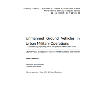 无人驾驶地面车辆(UGVs)可用于军事领域,以减轻士兵承担的风险,以及为体力要求高、枯燥或危险的任务提供解决方案。虽然使用UGV有好处,但也有需求和限制。本论文探讨了最终用户--瑞典武装部队的一个轻步兵营--对于为城市地形中的军事行动而设计的UGV在功能方面的要求。这是通过一个带有焦点小组的探索性案例研究来完成的,来自第31游骑兵营的士兵和军官使用两种不同的UGV原型来完成任务。随后是半结构化的小组讨论,探讨了需求、限制和要求。然后,通过主题分析方法对收集的数据进行分析。