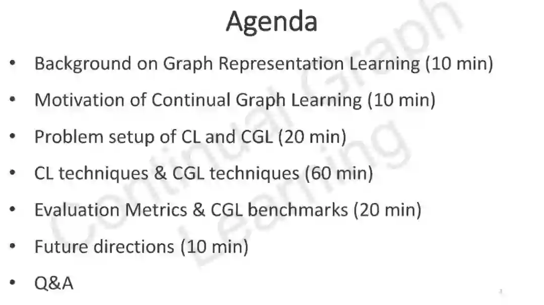 在过去的几年中,图上的深度学习在各个领域取得了显著的进展。然而,大多数图学习任务假设图是静态的,而现实世界的图可能会不断增长或演变。因此,研究如何在不忘记之前学习的知识的情况下,不断地使图学习模型适应新的模式/任务是至关重要的。为此,在本教程中,我们将介绍持续图学习(CGL)的新领域。具体来说,我们将(1)介绍不同的持续图学习设置,(2)提出CGL中的关键挑战,(3)强调现有的CGL技术,以及(4)讨论未来的方向。本教程时长为3小时,包括150分钟的演示和30分钟的问答。