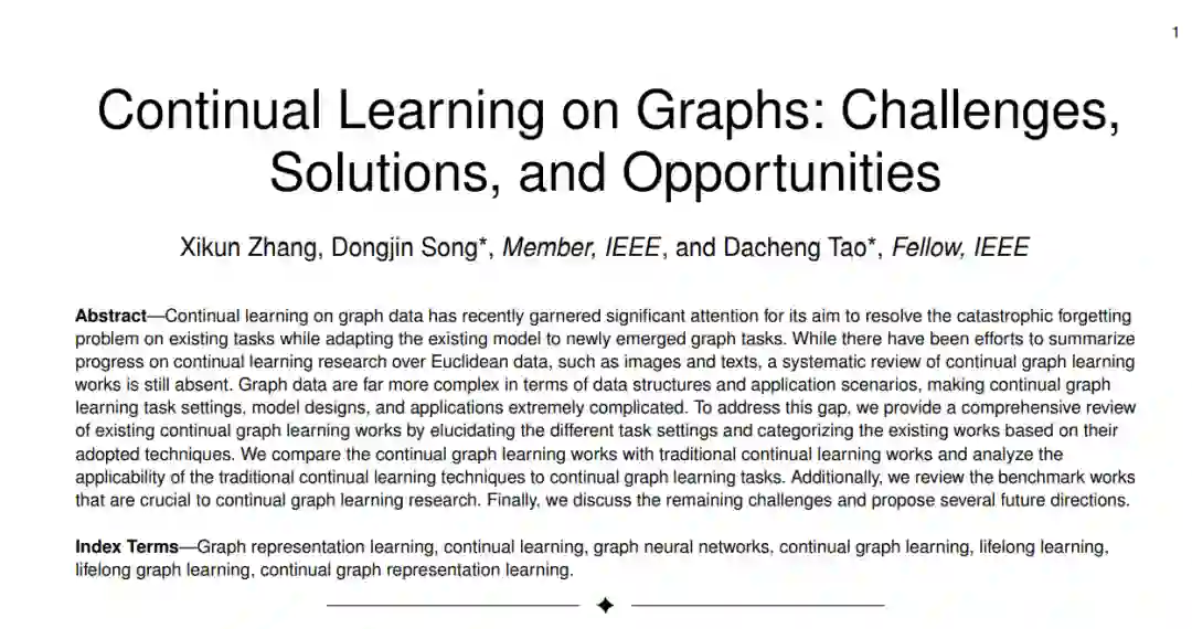 为此,本文从上述角度对现有方法进行了系统综述。论文的其余部分组织如下。在第3节中,从基本概念、骨干模型框架、任务序列构建、任务粒度、增量场景以及评估指标等角度解释了持续图学习的问题设置。在第四部分中,我们首先系统地回顾了持续学习技术的研究进展,包括基于正则化的方法、基于记忆回放的方法和基于参数隔离的方法,然后分析了传统持续学习技术的适用性;在第6节中,介绍了最近提出的基准工作,旨在提供一致的实验环境和公平的性能比较平台。然后,分析了传统持续学习技术对持续图学习任务的适用性;最后,我们还介绍了基准工作,为比较不同技术提供了一个公平的平台。最后,在第7节中,讨论了CGL研究面临的挑战和有希望的未来方向。