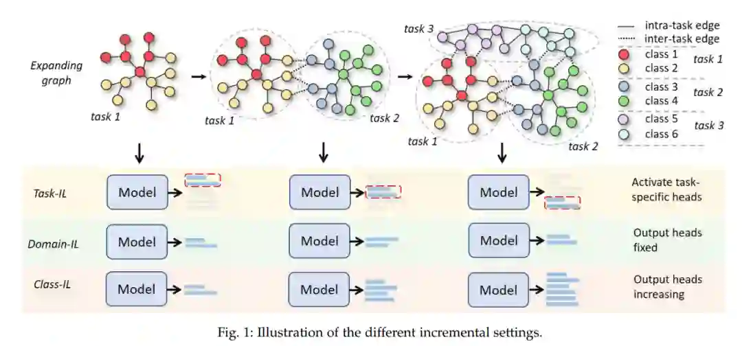 根据测试过程中是否提供任务标识以及是否需要模型来获取任务标识,持续图学习以及经典的持续学习可以分为任务增量学习(task- il)、领域增量学习(domain-IL)和类增量学习(class-IL)。