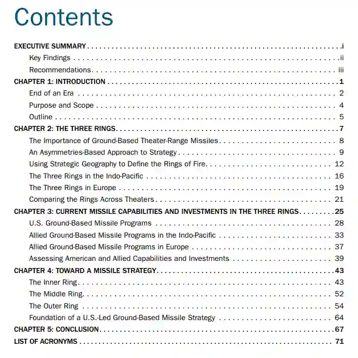美国必须推行一个连贯的导弹战略,以指导系统的采购、部署和使用。美国不能不假思索地重演冷战时期的剧本。今天的地基导弹战略必须适应当前印度-太平洋和欧洲战场独特的地理、政治、战略、技术和联盟情况。通过提出三环框架,作为国防规划人员和外交官思考美国及其盟国可用的导弹选项的工具,本研究是朝着制定常规地基导弹战略,缩小美国与其对手之间打击差距迈出的第一步。