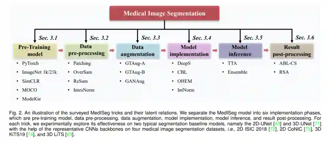细节决定成败。在这项工作中,为了揭示技巧对MedISeg模型(如图2所示)的影响,根据一套完整的实现阶段,包括预训练模型(参考3.1节)、数据预处理(参考3.2节)、数据增强(参考3.3节)、模型实现(参考3.4节)、模型推断(参考3.5节)和结果后处理(参考3.6节),我们首先收集了一系列在当前的MedISeg模型中被忽略的实用的和有代表性的技巧。然后,借助代表性卷积神经网络(CNNs)骨干网,在包括典型2D-UNet[43]和3D-UNet[71]在内的一致分割基线模型上实验探索这些技巧的有效性,从而避免模型变量的影响(即由于模型变化而导致的性能变化)。相比于现有论文驱动的技术调研,只平淡地关注图像分割模型的优点和局限性分析,我们的工作提供了大量的扎实的实验结果,在技术上更具有可操作性。基于四种医学图像数据集(即具有挑战性的2D ISIC 2018病灶边界分割数据集[72]、2D结肠核识别和计数挑战数据集[73]、[75]、3D肾脏肿瘤分割2019数据集[74]和3D肝脏肿瘤分割挑战数据集[63])上的大量实验结果,我们明确阐明了这些技巧的效果。此外,基于所调研的技巧和使用的基线模型,我们还开放了一个强大的MedISeg存储库,其中每个组件都具有即插即用的优势。相信这一里程碑式的工作不仅完成了最先进的MedISeg方法的全面技术调研,而且为解决未来医学图像处理(特别是密集图像预测任务)的挑战(包括小数据集学习、类不平衡学习、多模态学习和领域适应)提供了实用指南。