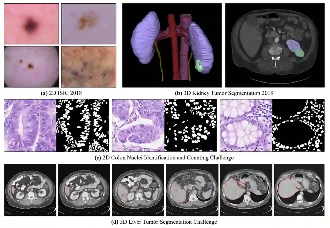 图3。在一些实验样本中,(a)中的图像来自2D ISIC 2018[72]训练集,(b)中的图像是渲染场景和分割轴向切片,来自3D肾肿瘤分割2019数据集[74],(c)中的图像来自2D结肠核识别和计数挑战数据集[75],(d)中的图像来自3D肝肿瘤分割挑战数据集[63]。(图片来自发布的数据集或其官方网站)。 结论我们为不同的实现阶段收集了一组MedISeg技巧,即预训练模型、数据预处理、数据增强、模型实现、模型推断和结果后处理。这些技巧几乎涵盖了用于医学图像分割任务的所有常见和基本方案;其他精细的技巧可以被看作是这些技巧更复杂的组合。在我们的工作中,为了避免实现变化带来的性能模糊性,我们在一致的2D-UNet[43]和3D-UNet[71]基线模型上实验探索了收集到的技巧的有效性。通过在2D ISIC 2018[72]、2D CoNIC[73]、[75]、[95]、3D KiTS19[74]和3D LiTS[63]上的实验结果,我们明确地阐明了这些技巧的效果。此外,基于调研的技巧和基线模型,为2D和3D医学图像开源了一个强大的MedISeg库,其中每个组件都具有即插即用的优势。与现有的纸质细分调查[10],[77],[144],[145],[159],[163],[170],[195]相比,我们的工作可以提供广泛的实验,在技术上更具可操作性。我们工作的一个重要贡献是明确地探索这些收集的技巧的效果。我们的工作既能促进后续方法的注意力技巧,又能达到比较公平的结果。这可能是必要的,特别是在当前,面对一些复杂的任务,网络架构变得越来越复杂,例如,图像分割[180],[184],目标检测[45],[176],和图像生成[77],[112]。此外,当我们将所有常用的技巧整合到一个统一的框架中[61]时,MedISeg模型中的技巧之间可能存在实现上的冲突或抵消,这可以为即将到来的分割管道提供经验和协调的指导,包括网络架构、训练策略和损失函数。 未来我们将在以下几个方面进行工作: (1)在MedISeg上调研和开发更多的技巧。在临床实践中,我们经常面临非常复杂的情况,而MedISeg是一个与实践紧密结合的基础研究课题。因此,在现有的基础上继续探索和开发一些更先进的MedISeg技巧,以满足不同问题的要求,具有很大的实用价值和意义**。(2) 继续探索技巧在更多方法和数据集上的有效性**。在少量有限的数据集上的实验结果不可避免地存在偏差。特别是在面对MedISeg问题时,内部类的不同图像类型、分布和发散会影响特定技巧的有效性。为了使实验结果的比较更加全面和公正,有必要进行全面的技术调研。(3) 探索受技巧启发的模型设计。虽然在现有的出版中技巧很容易被忽略,但它们包含的原理和思想可以用来启发后续的工作,以实现更便宜和计算友好的模型设计。(4) 探索基于注意力的技巧。近年来,视觉transformer框架通过多头注意力机制具有很强的特征表示能力,在计算机视觉和医学图像分析领域受到越来越多的关注。然而,由于视觉transformer内部结构复杂,实践应用尚不成熟(特别是面对小数据集时),其进一步的应用还有待探索。因此,对视觉transformer框架进行技巧研究也是很有价值的。
