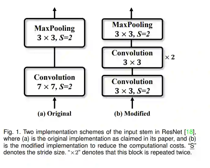 然而,进展的迹象不是单独提出的,它们通常与现有的实现混合在一起[60],[61]。特别是,目前,一个完整的MedISeg系统通常由大量的实现细节(包括一些非学习模型无关的预处理过程)组成,以实现理想的最先进的识别性能[5],[62]-[65]。不幸的是,官方出版物中很少有边缘实现描述(也称为“技巧”),或者只在发布的代码中介绍(在补充材料中有一些)。例如,如图1所示,在流行的ResNet[18]体系结构(通常被视为MedISeg模型的主流骨干网)的修改输入干中,使用三个累积的3 × 3卷积层(图1 (b))来取代输入干中原来的7×7卷积层(图1 (a)),以减少计算成本[66]-[68]。尽管这种细微的变化可以显著提高[21],[61],[69],[70]的准确性,但很少有出版物明确提及这一点。因此,将基于这种修改后的实现的性能与基于原始实现的性能进行比较本质上是不公平的。